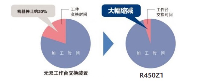 加工时间短的情况下,为了增加工件交换时间的分割,无随行工作台交换装置的机器生产效率很低。R450Xd1机型在节省工件交换所浪费时间的同时能够充分发挥高生产效率。