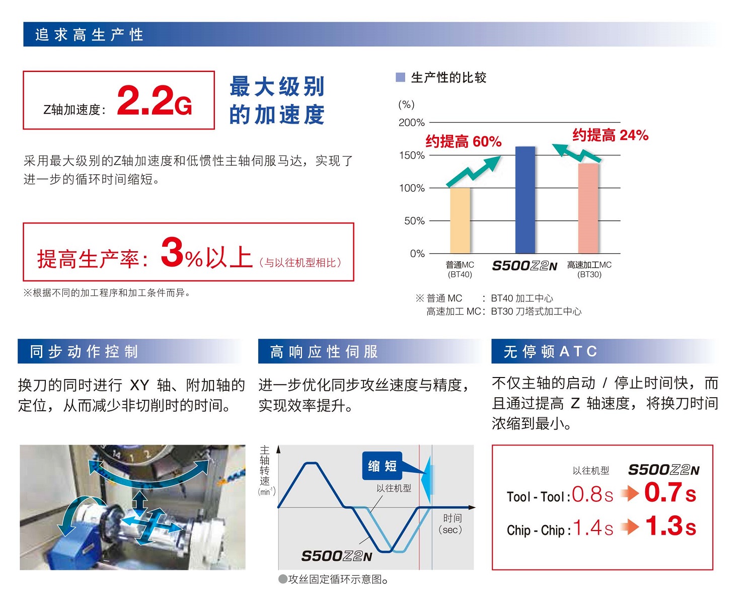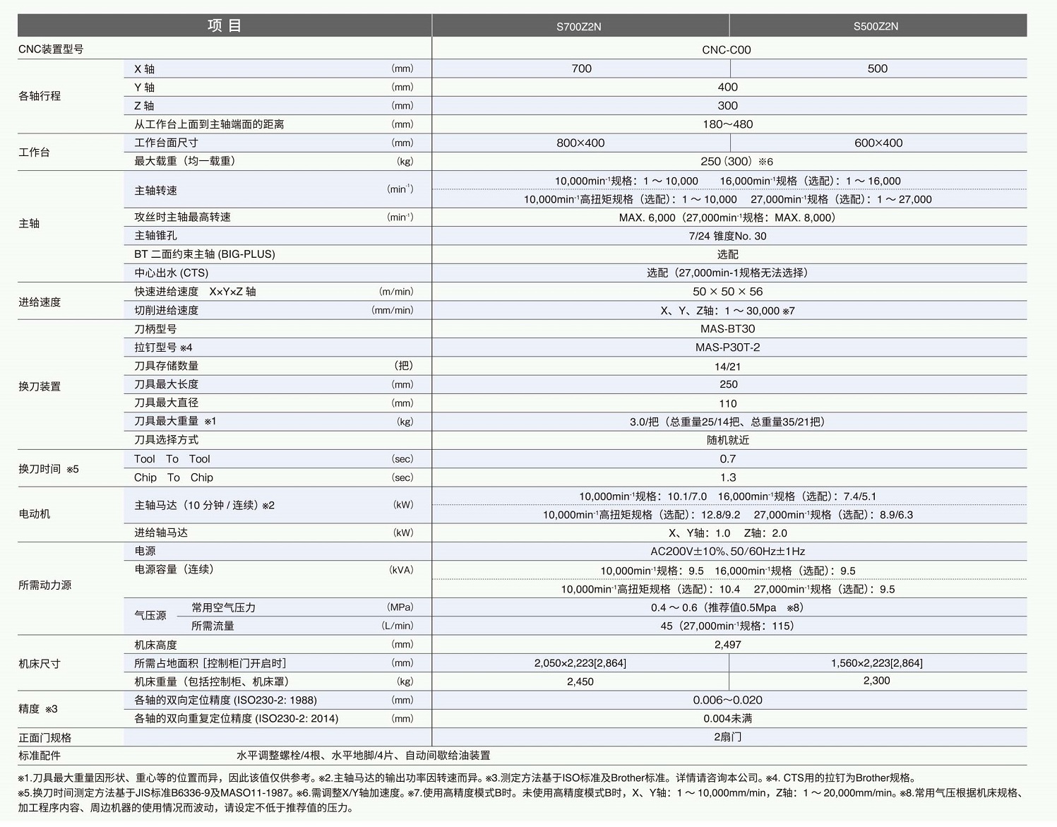 S500/S700Z2N是兄弟公司在中国生产的紧凑型新一代加工中心。XYZ轴的快速移动速度达到了50/50/56 m/分,刀具交换速度为T-T0.7秒,C-C1.3秒,刀具交换机构更改为伺服式,实现无间断换刀,非切削时间明显减少。另增加选配大扭矩主轴功能,可适应大径孔的钻孔攻丝的加工。高速主轴及预读功能的加强,提升了3D的加工能力。